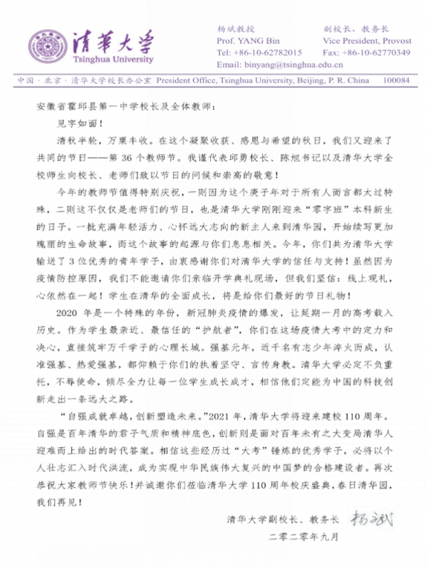 清華大學(xué)副校長、教務(wù)長楊斌教授以致感謝信的方式,代表清華大學(xué)校長邱勇、黨委書記陳旭及清華大學(xué)師生們向霍邱一中老師們致以教師節(jié)美好的節(jié)日祝福和崇高的同行敬意。