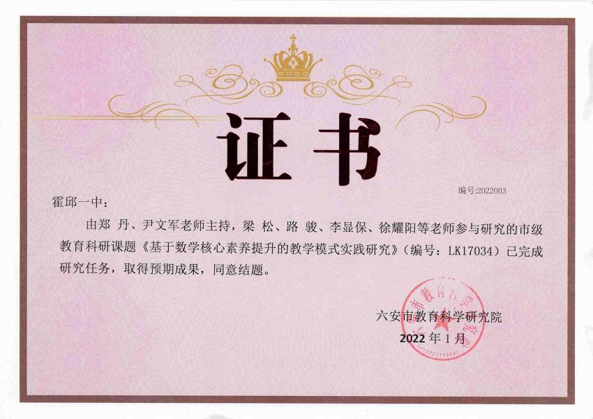 霍邱一中《基于數(shù)學(xué)核心素養(yǎng)提升的教學(xué)模式實(shí)踐研究》等7項(xiàng)市級(jí)課題已順利結(jié)題,六安市教育科學(xué)研究院向這7個(gè)課題的研究組頒發(fā)了結(jié)題證書(shū)。