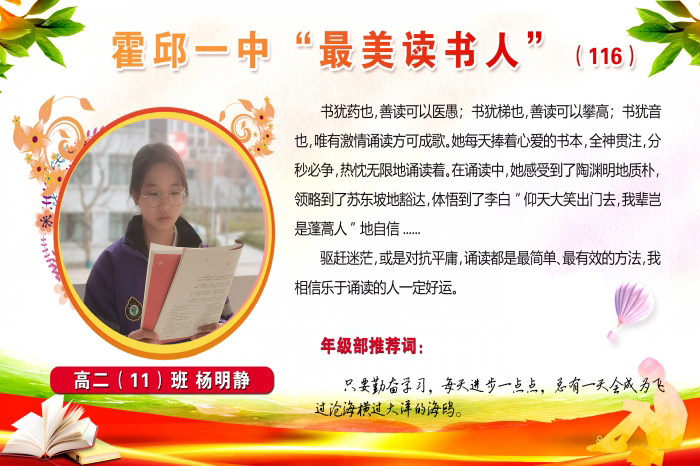 打開(kāi)書,就可以開(kāi)始一場(chǎng)穿越時(shí)空的美妙旅行。高二(11)班楊明靜同學(xué)曾獲第116期“最美讀書人”榮譽(yù)稱號(hào)。她感慨道:在誦讀中,感受到了陶淵明的質(zhì)樸,領(lǐng)略到了蘇東坡的豁達(dá),體悟到了李太白“仰天大笑出門去,我輩豈是蓬蒿人”的自信;驅(qū)趕迷茫,或是對(duì)抗平庸,誦讀都是最簡(jiǎn)單、最有效的方法。