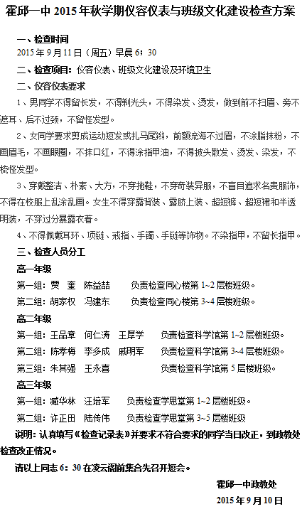 霍邱一中2015年秋學(xué)期儀容儀表與班級(jí)文化建設(shè)檢查方案