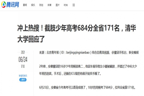 6月23到25日,騰訊網(wǎng)、中國(guó)青年網(wǎng)等多家主流媒體報(bào)道了霍邱一中周桐同學(xué)的奮斗事跡。
