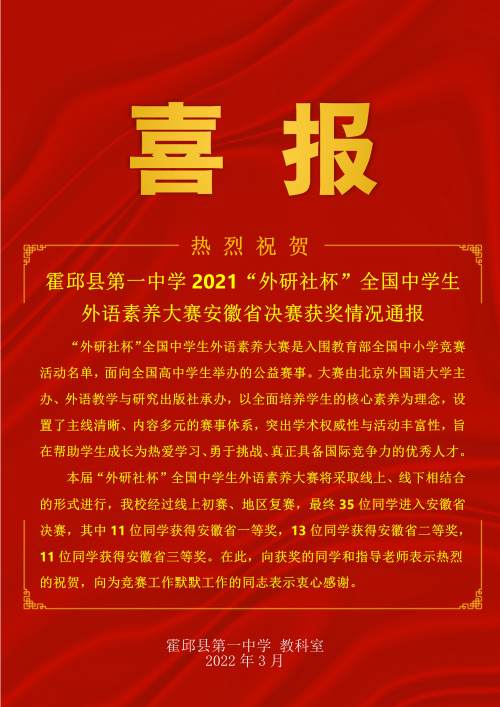 在2021年“外研社杯”全國(guó)中學(xué)生外語(yǔ)素養(yǎng)大賽安徽省決賽中,霍邱一中王建超等11名學(xué)生獲省級(jí)一等獎(jiǎng),另有13名學(xué)生獲省二等獎(jiǎng),11名學(xué)生獲省三等獎(jiǎng)。