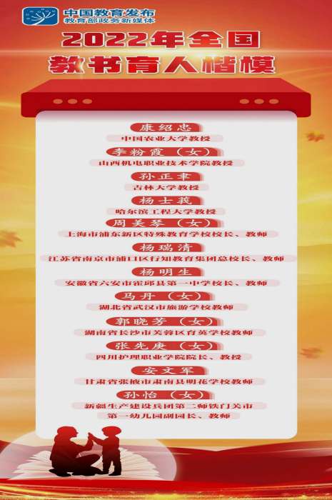 據(jù)悉,2022年度"全國(guó)教書(shū)育人楷模"推選活動(dòng)采取自下而上、逐級(jí)推薦的方式,由各省(自治區(qū)、直轄市)及新疆生產(chǎn)建設(shè)兵團(tuán)推薦產(chǎn)生候選人,從中產(chǎn)生"全國(guó)教書(shū)育人楷模"。