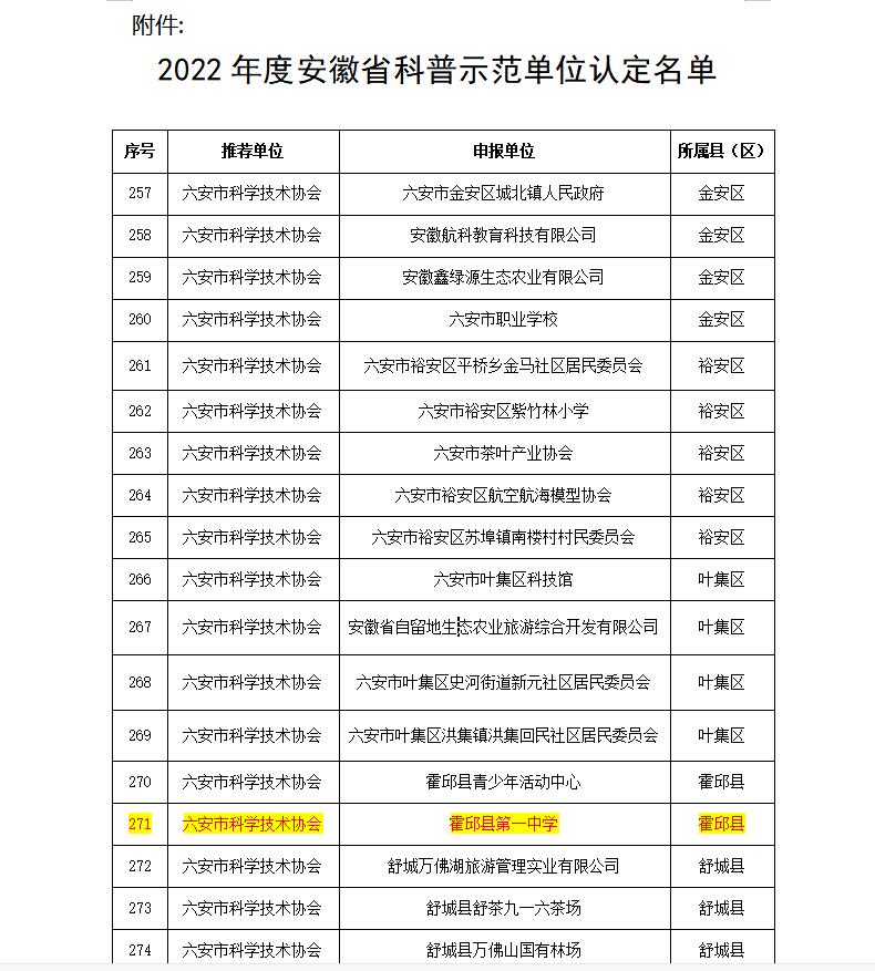 日前,安徽省科協(xié)網(wǎng)站公布了2022年度安徽省科普示范單位認(rèn)定名單,霍邱一中在列。