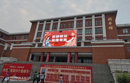 學(xué)校圖書館的LED戶外屏幕從9月9日早6點(diǎn)起至9月10日晚22點(diǎn),以字幕滾動(dòng)方式深情播出:“躬耕教壇,強(qiáng)國(guó)有我”、“老師,您好!”、“教師節(jié)快樂!”、“老師,您辛苦了!”、“賡續(xù)百年初心,擔(dān)當(dāng)育人使命”等標(biāo)語。